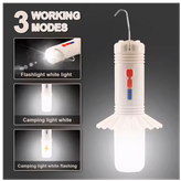 نور قوی و حالتهای مختلف: دارای چراغ قوه در قسمت زیرین و لامپ در بخش بالایی برای استفاده بهعنوان چراغ دستی یا چراغ آویز.