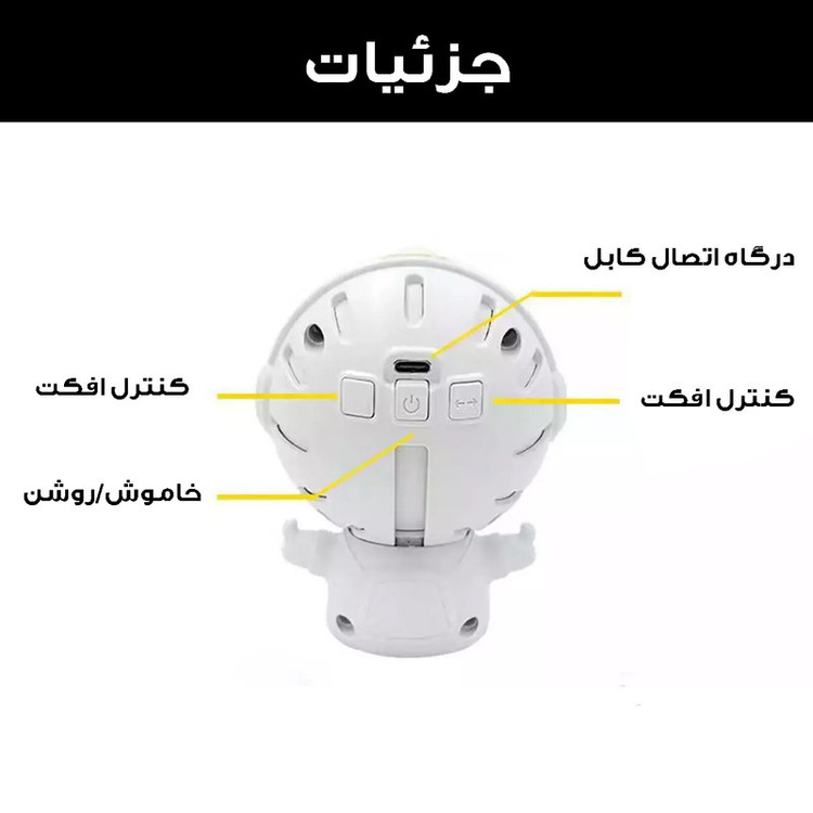 این پروژکتور با طرح فضانورد با ایجاد نورهای رویایی و رنگارنگ در تاریکی شب، میتواند فضایی بسیار جذاب و آرامشبخش را برای شما ایجاد نماید. پرژکتور سحابی فضانورد با 12 جلوه رویایی و رنگارنگ و قابلیت کنترل از راه دور میتواند یک هدیه زیبا برای عزیزانتان باشد. در مهمانی و دور همیهایتان، برای گرفتن عکس های فانتزی و هنگام بازی با پروژکتور ال ای دی محیط خود را نورپردازی کنید. سر آن را می توان در 90 درجه و بازوهای آن را در 360 درجه به دلخواه تنظیم کرد و با ایجاد زاویه دلخواه؛ محیطی رنگارنگ ایجاد نمایید. اندازه آن 93×85×113 میلی متر است که مینیمال و کوچک بوده و فضای کمی را اشغال میکند. همچنین میتوانید پروژکتور را به راحتی با خود حمل نمایید. همراه این محصول یک ریموت کنترل ارائه شده و شما میتوانید از راه دور هم آن را خاموش و روشن کرده و یا تنظیمات مورد نظر خود را روی آن اعمال کنید. همچنین با استفاده از کلیدهای طراحی شده روی بدنه هم امکان اجرای دستورات وجود دارد. توجه : این محصول شارژی نیست و با اتصال دائم کابل تایپ سی ( به پاور بانک ، لپتاپ ، انواع سری های شارژر و ... ) کار می کند و نگرانی از بابت تمام شدن شارژ دستگاه ندارید .