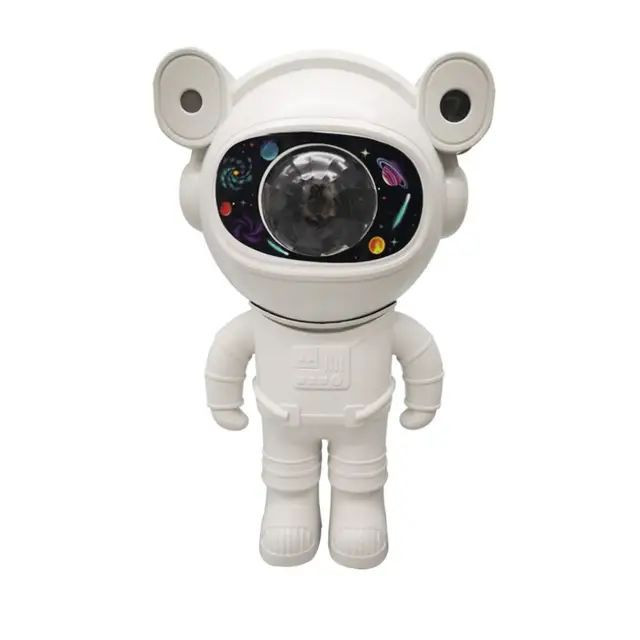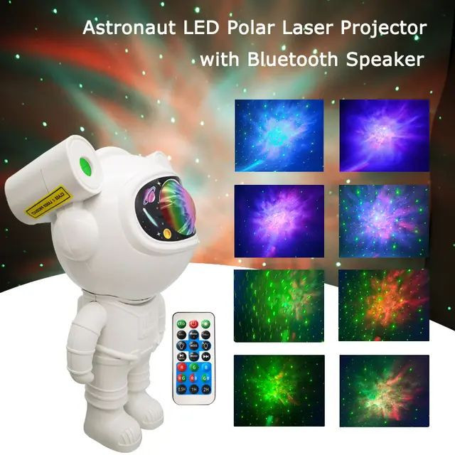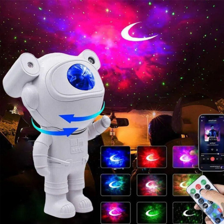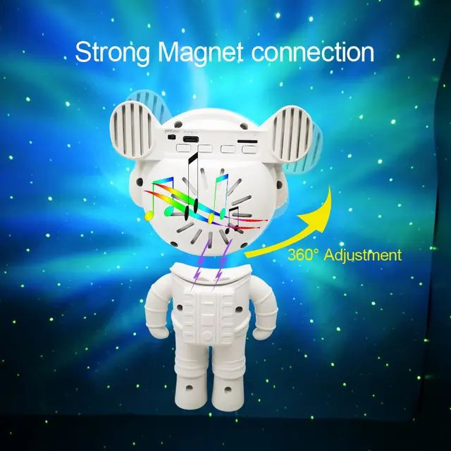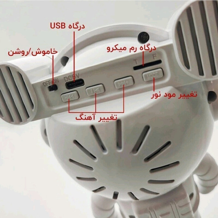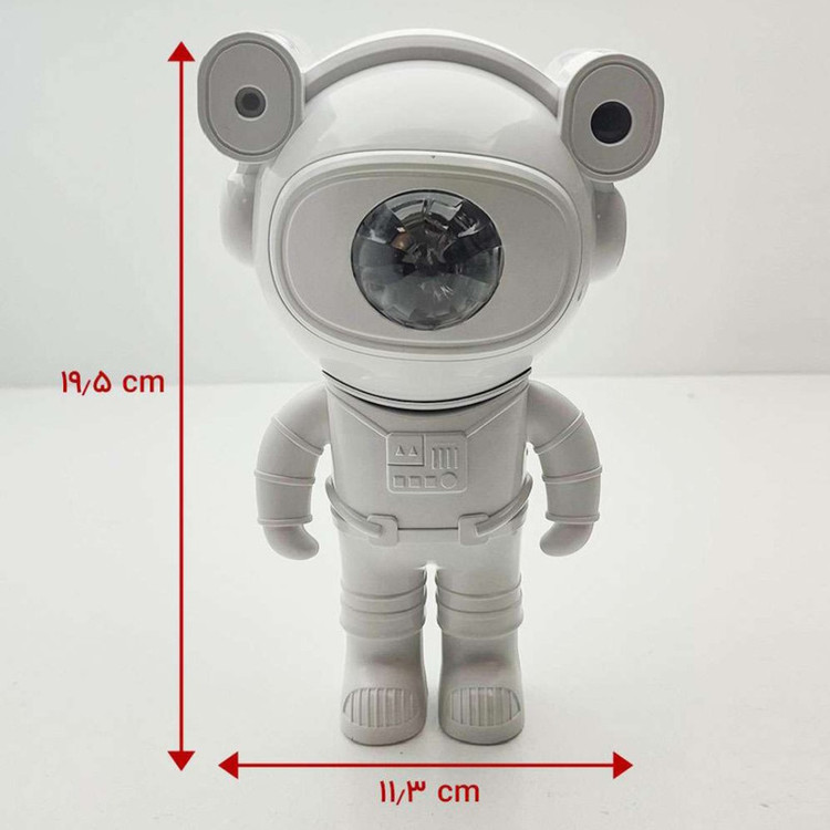 چراغ خواب کهکشانی طرح فضانورد لیزردار مدل بلوتوثی اسپیکر دار یک چراغ خواب یا نورپردازی با قابلیت پخش افکت تصویر زنده کهکشانی در رنگ های مختلف به همراه لیزر ستاره ای بر روی سقف و دیوار اتاق یا هر سطح دیگری است که به همراه افکت لیزر ستاره ای حس یک سفر کهکشانی را به شما میدهد . این چراغ کهکشانی دارای یک اسپیکر بلوتوثی در قسمت پشت سر خود می باشد که میتواند برای شما هر موسیقی را از طریق گوشی یا تبلت پخش نمایید تا بتوانید از آن لذت ببرید. همچنین قابلیت قرار دادن رم میکرو و پخش موزیک از طریق آن را دارا می باشد. تلفیق همزمان تصویر زنده کهکشانی و لیزر ستاره ای و اسپیکر بلوتوثی جذابیت اتاق خواب و یا هر محیطی که در آن قرار دارید را در هنگام شب چندین برابر میکند. این محصول دارای ریموت کنترل نیز می باشد که میتواند تمامی دستور های مورد نیاز از قبیل روشن و خاموش، ولوم صدا، میزان سرعت چرخش موتور، میزان نور پرژکتور یا لیزر را کم یا زیاد و یا برای روشن ماندن محصول تایمر تعریف کنید که سر ساعت مشخص شده خاموش بشود. همچنین قابلیت تغییر موزیک، قطع و وصل موزیک، تغییر مود و حالت های رنگی مختلف را دارا می باشد. این رقص نور جذاب دارای درگاه برق USB Type-c می باشد که می توانید آن را با پاوربانک یا آداپتور موبایل یا هر دستگاه دیگری روشن کنید و هرجایی که دوست دارید استفاده کنید و لذت ببرید. با استفاده از این چراغ کهکشانی زیبا، جلوه ای خاص به اتاق خواب، مراسمات و جشن های خود ببخشید. یک ویژگی جالب دیگر این دستگاه، اتصال سر فضانورد بصورت آهنربایی به بدنه است که به آسانی جدا شده و بدون پایه نیز قابل استفاده است. لازم به ذکر است این به دلیل داشتن موتور و لیزر و اسپیکر نیازمند آداپتور شارژر قوی تر بوده و از شارژرهای ضعیف استفاده نکنید تا برق مورد نیاز محصول تامین گردد.